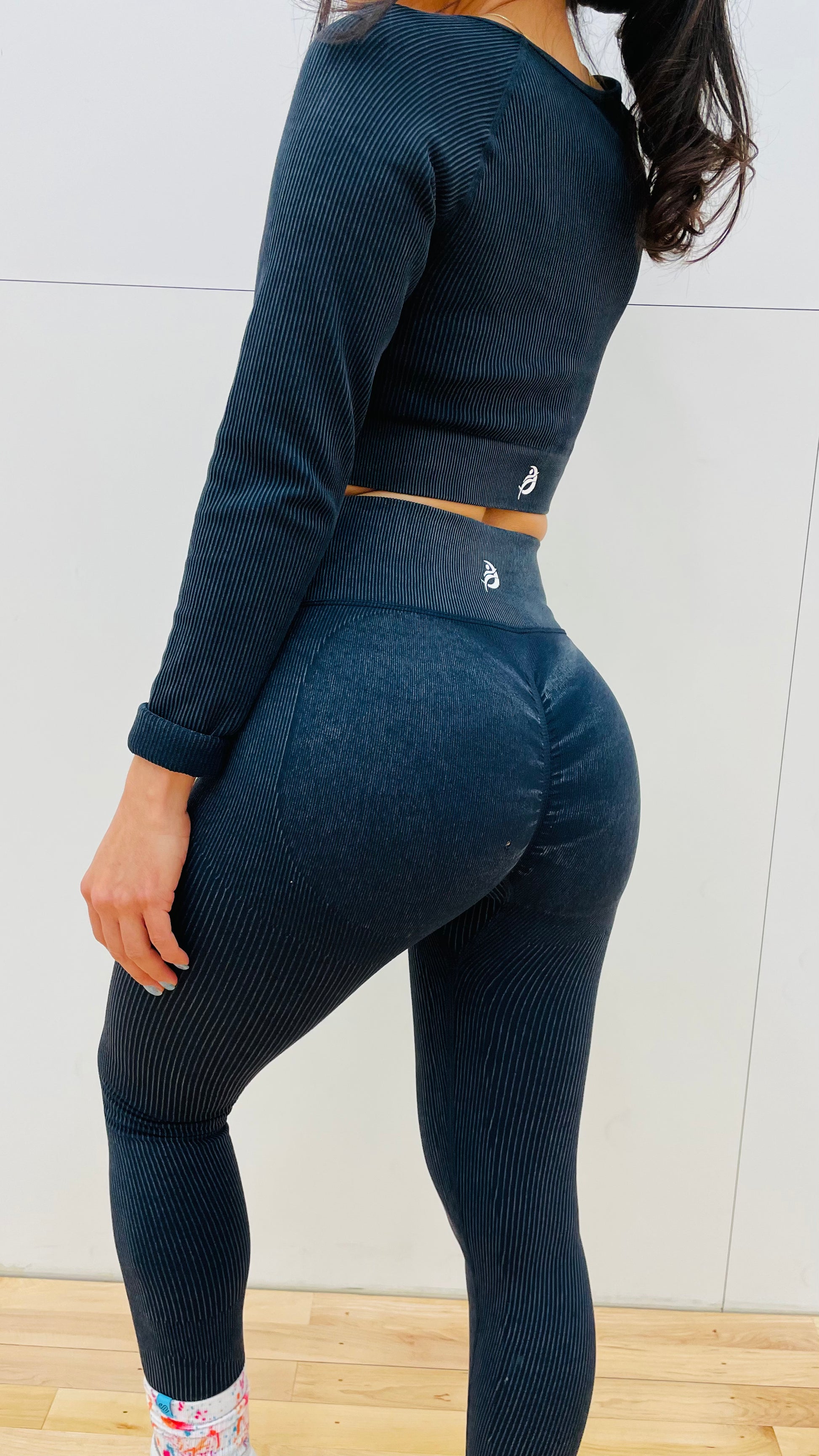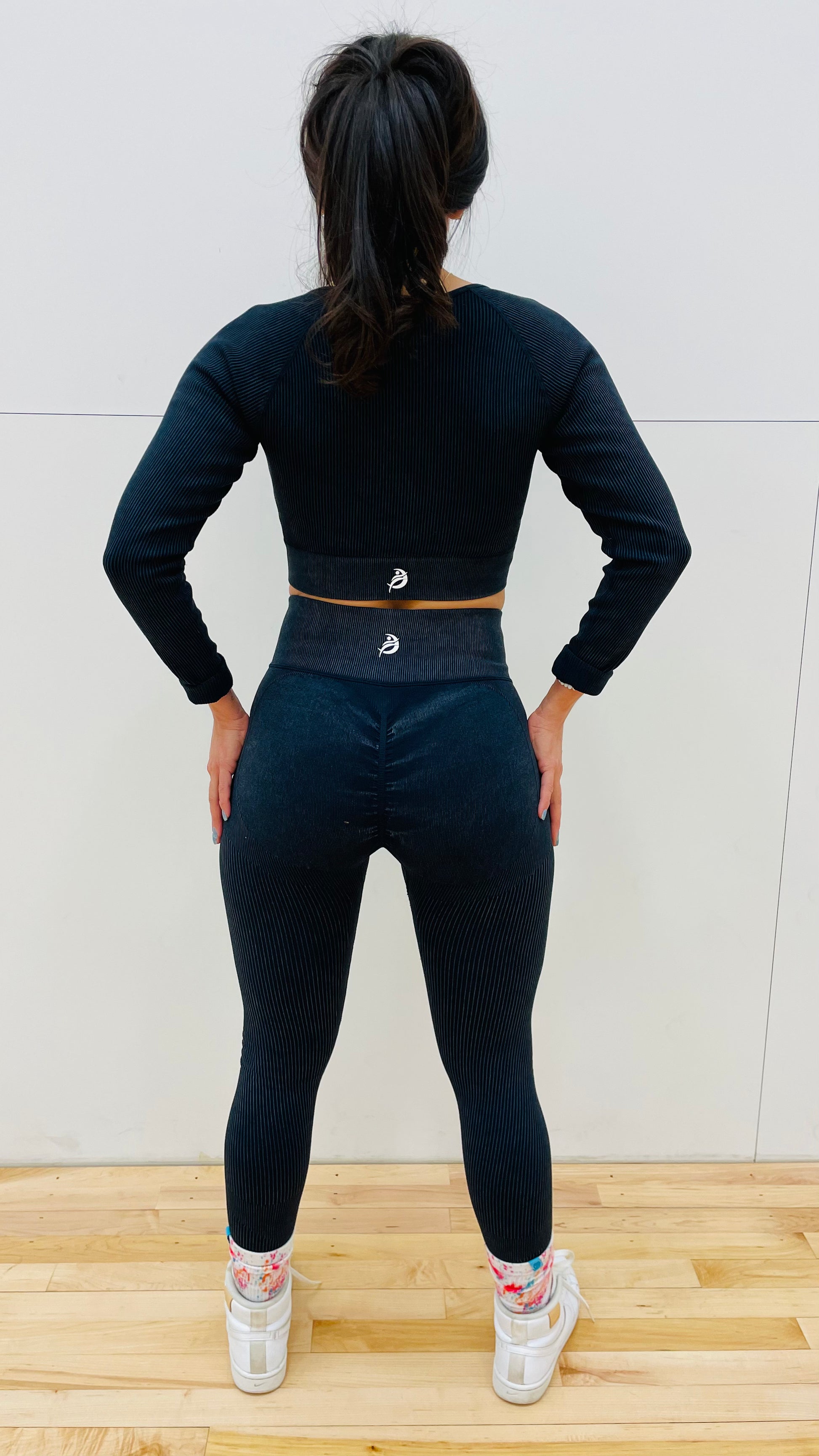 Our Energy Carbon Black top is designed in our seamless acid wash fabric with a secure ribbed underband for support. Also features a curved neckline and long sleeve designed for flexibility and perfect matching with our leggings.