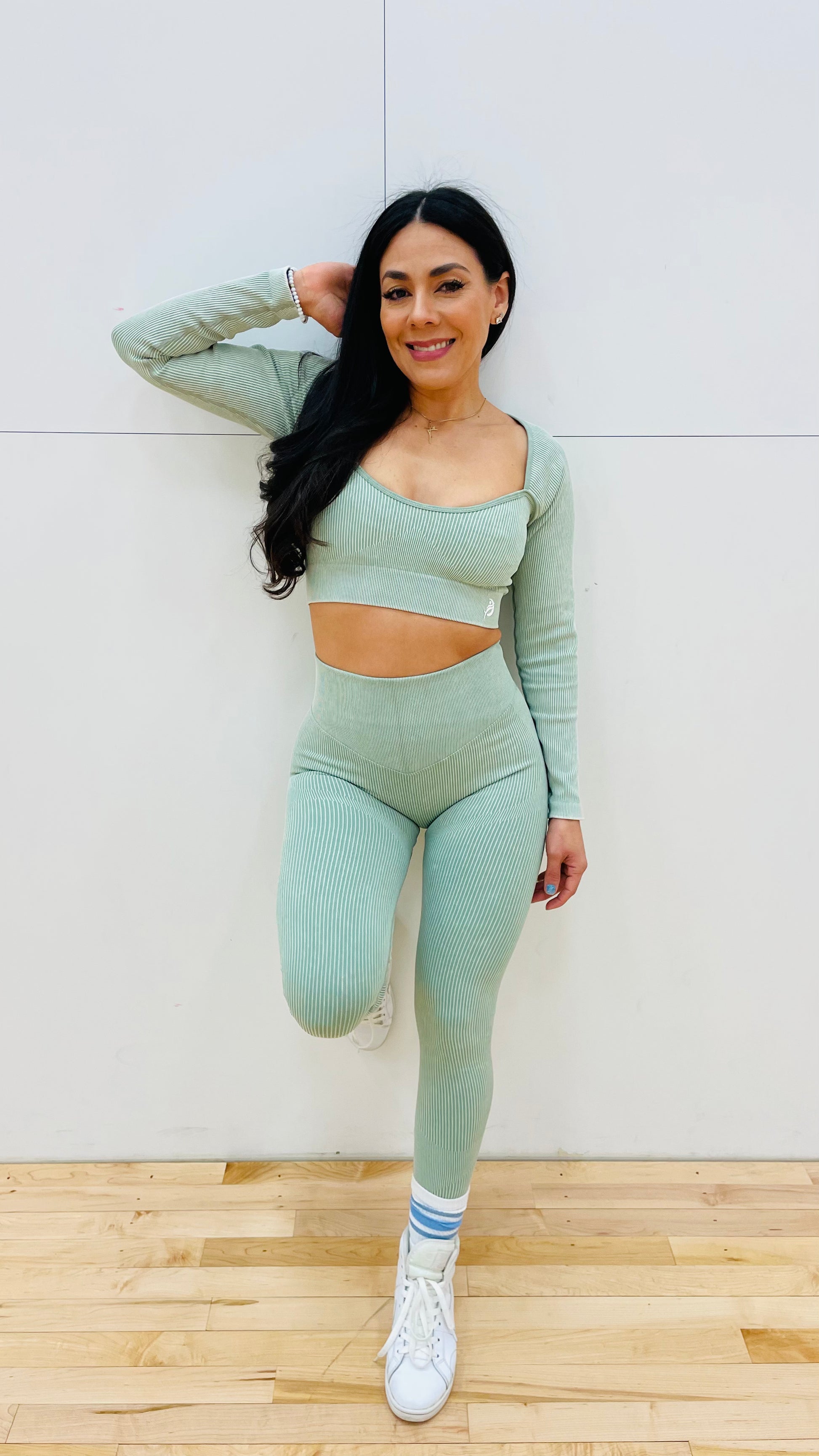 Our Energy top is designed in our seamless acid wash fabric with a secure ribbed underband for support. Also features a curved neckline and long sleeve designed for flexibility and perfect matching with our leggings.