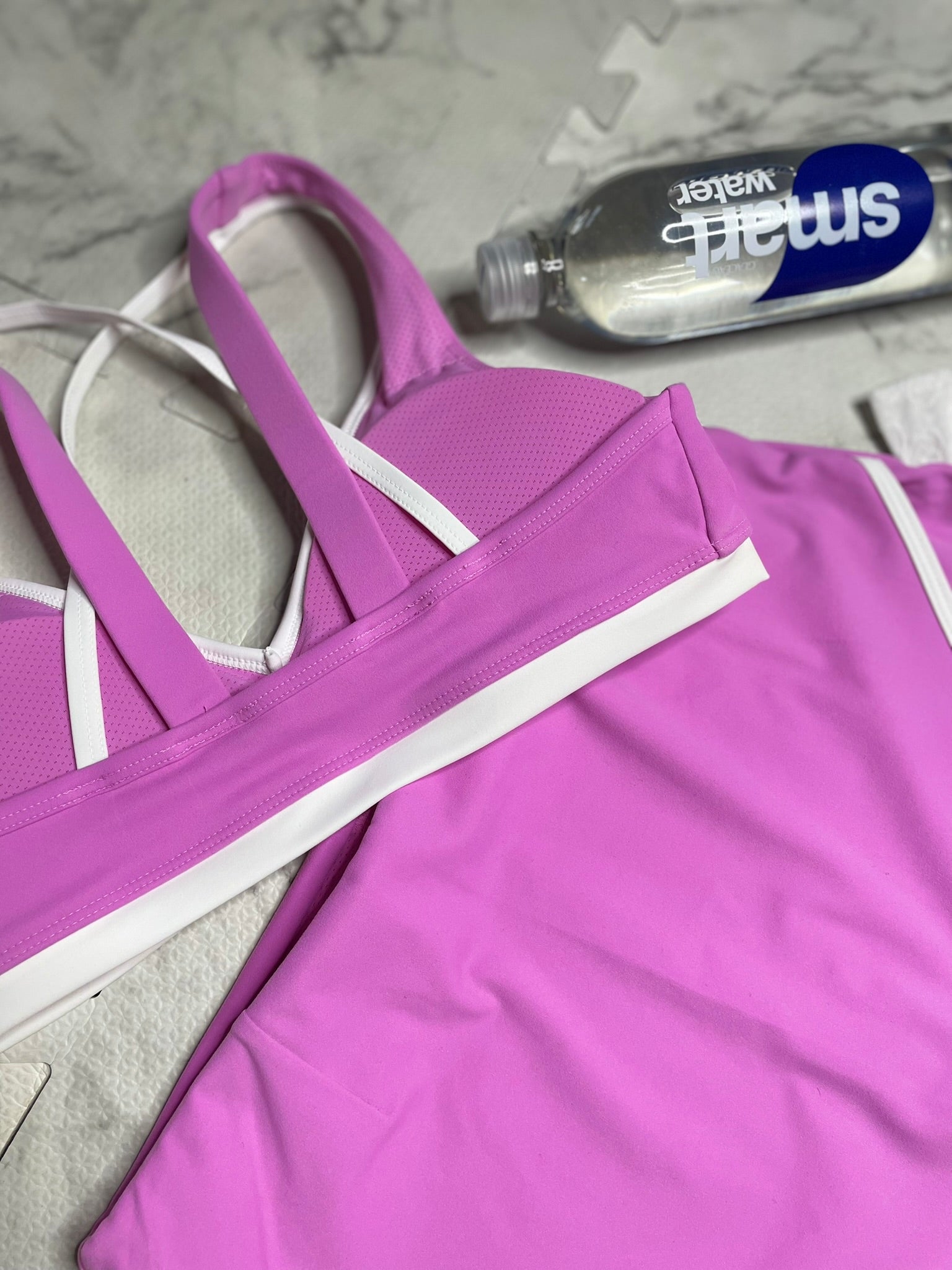 Experience the perfect combination of style and functionality with our Mini Skort Set in Candy Pink! The mini skorts feature a hidden shorts layer for added comfort, while the wide crossed strap sports bra provides medium support and a sleek look. With a V-neck design, push up paddings, and a high waisted band, this set is perfect for any outdoor activity, your daily or just for street style. Made with a breathable nylon and spandex blend for maximum comfort.