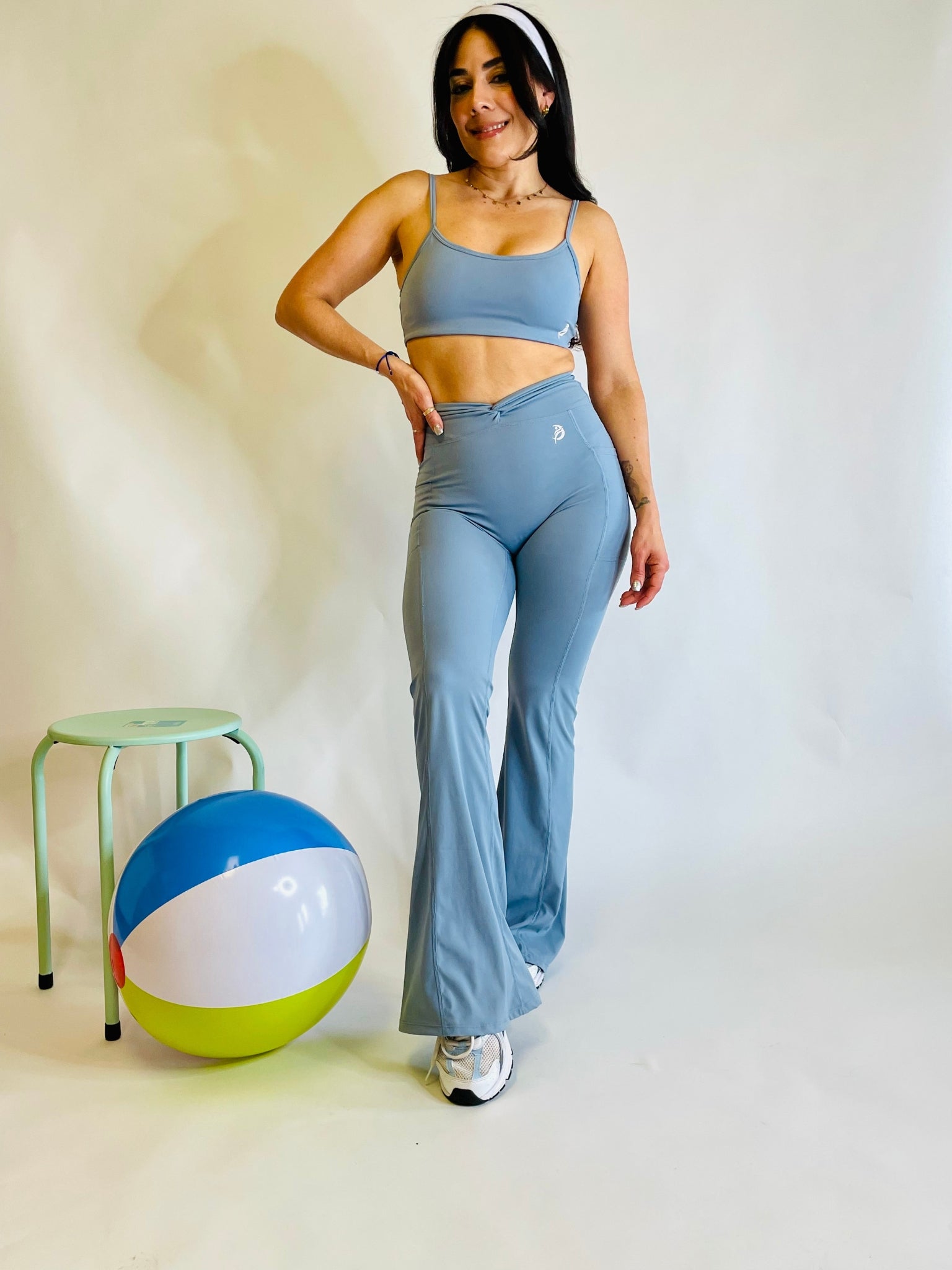 Introducing our Smoke Blue Flared Legging, designed for ultimate comfort and style. The high waisted and breathable fabric is soft to the touch, perfect for enhancing your silhouette and cinching your waist. With functional deep pockets and a twist knot v waistband, this 4-way stretch design is both practical and flattering. Finished with a double heat logo, these leggings are perfect for athleisure or training.